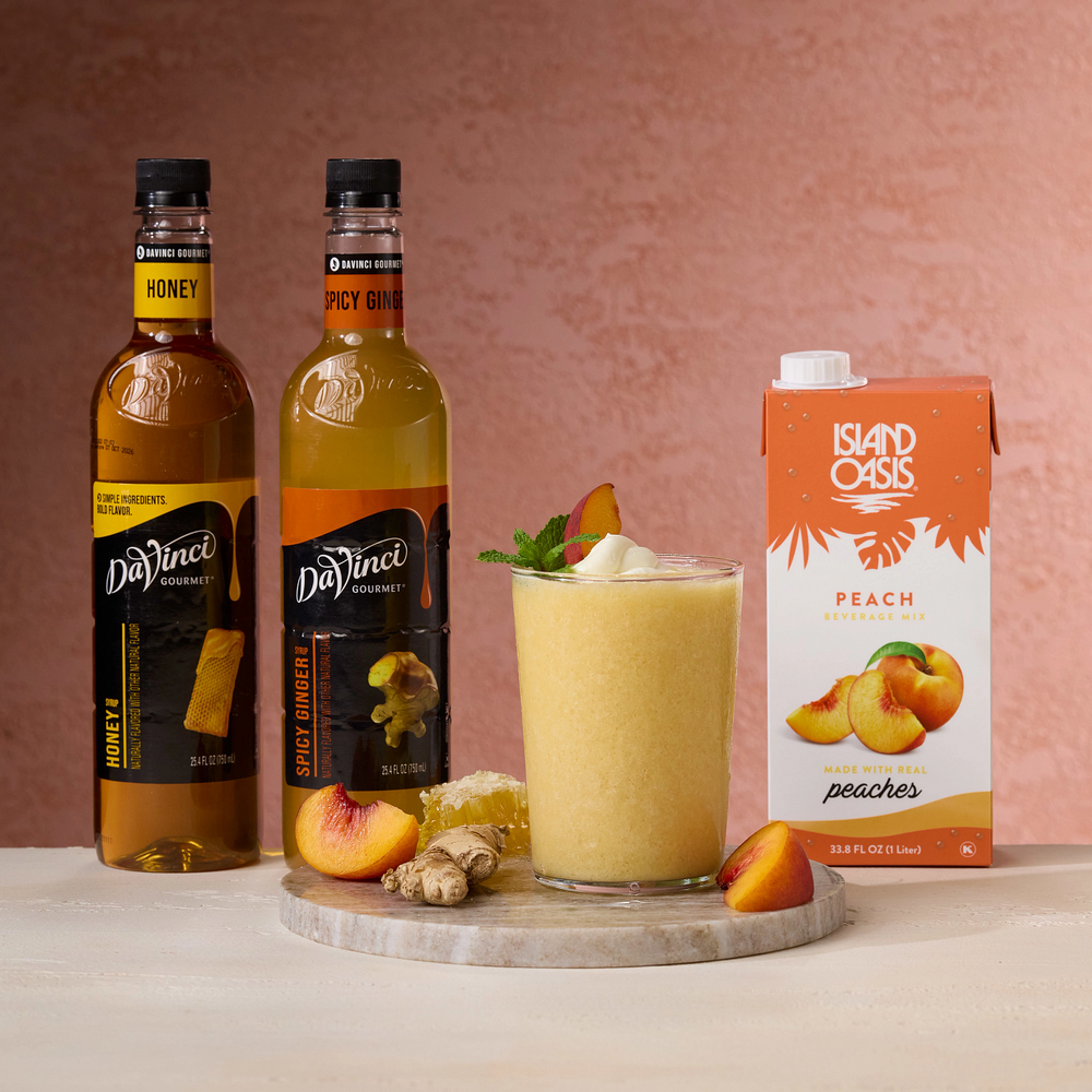 Sweet–heat meets creamy: Island Oasis Peach Beverage Mix blends with DaVinci Gourmet Spicy Ginger Syrup, DaVinci Gourmet Honey Syrup, and oat milk for a smooth, peach–forward smoothie — finished with whipped cream, peach, and mint.