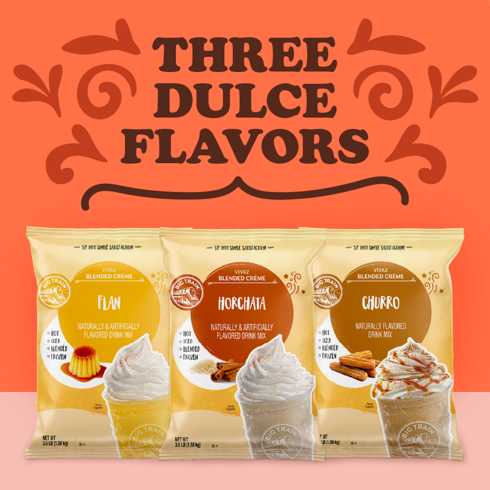 Tap into the growing demand of hispanic-inspired drinks with our two *new* Big Train Vivaz flavors: Churro and Flan! Alongside Horchata, this trio makes it easier than ever to make your menu más dulce.