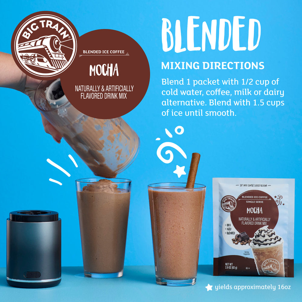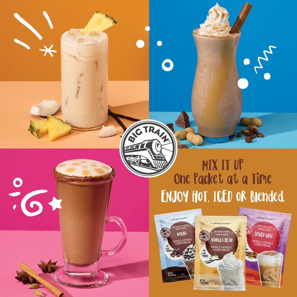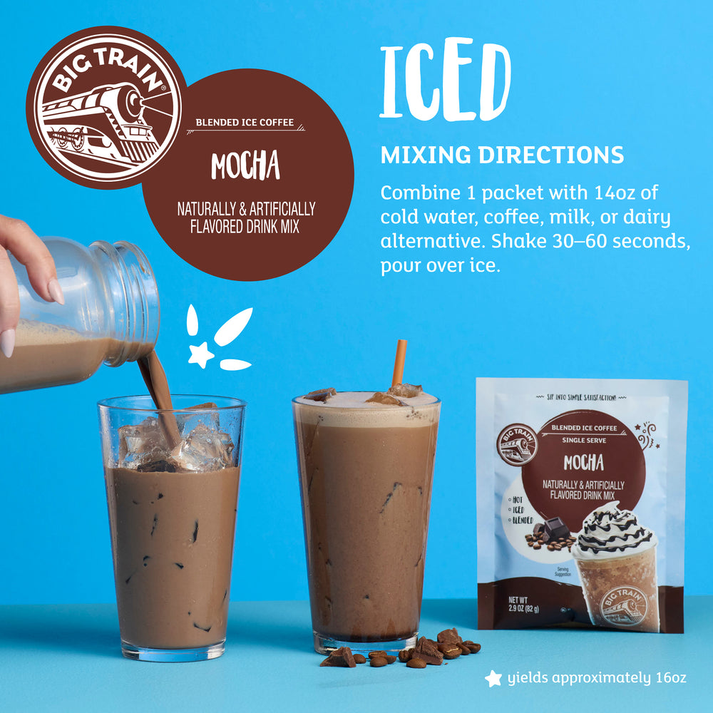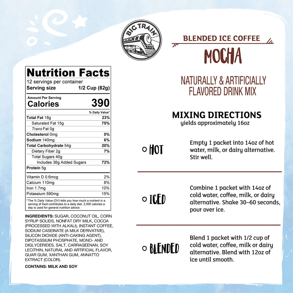Take iced coffee to the next level with Big Train Mocha Blended Ice Coffee Mix. Sourced from the highest-quality ingredients, our mocha frappe mix has big chocolate taste and a caffeine boost from Arabica coffee. The silky, smooth mocha frappe mix delivers a full-bodied taste and consistent texture every time. Add a dollop of whipped cream or a splash of cream to craft your own signature beverage. Indulge in rich cocoa and smooth coffee with Big Train Mocha Blended Ice Coffee Mix. Try it hot, iced, or blended. Each sachet is perfectly portioned for convenience and consistent flavor.