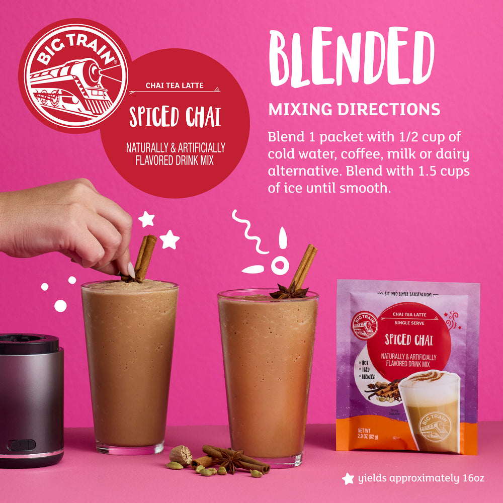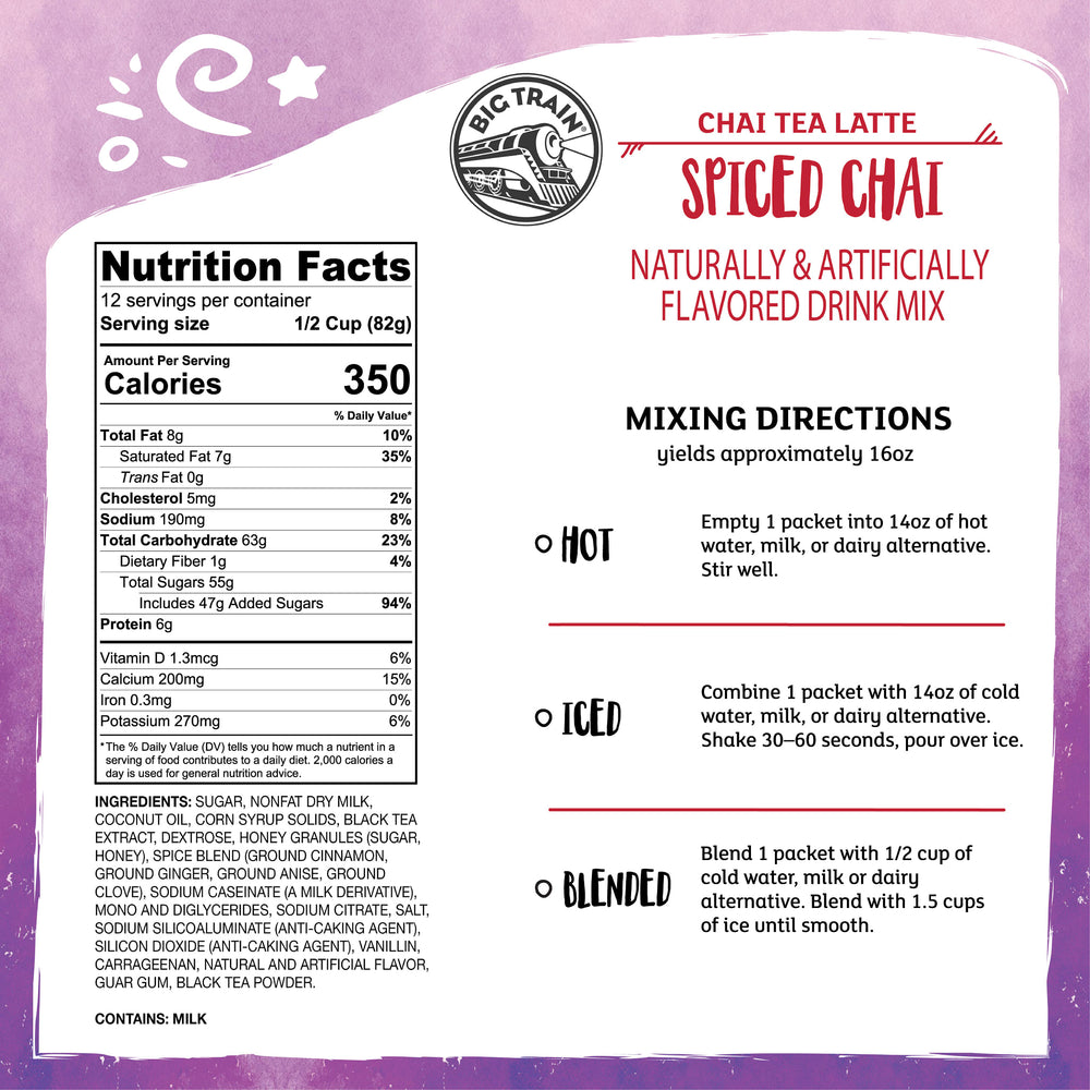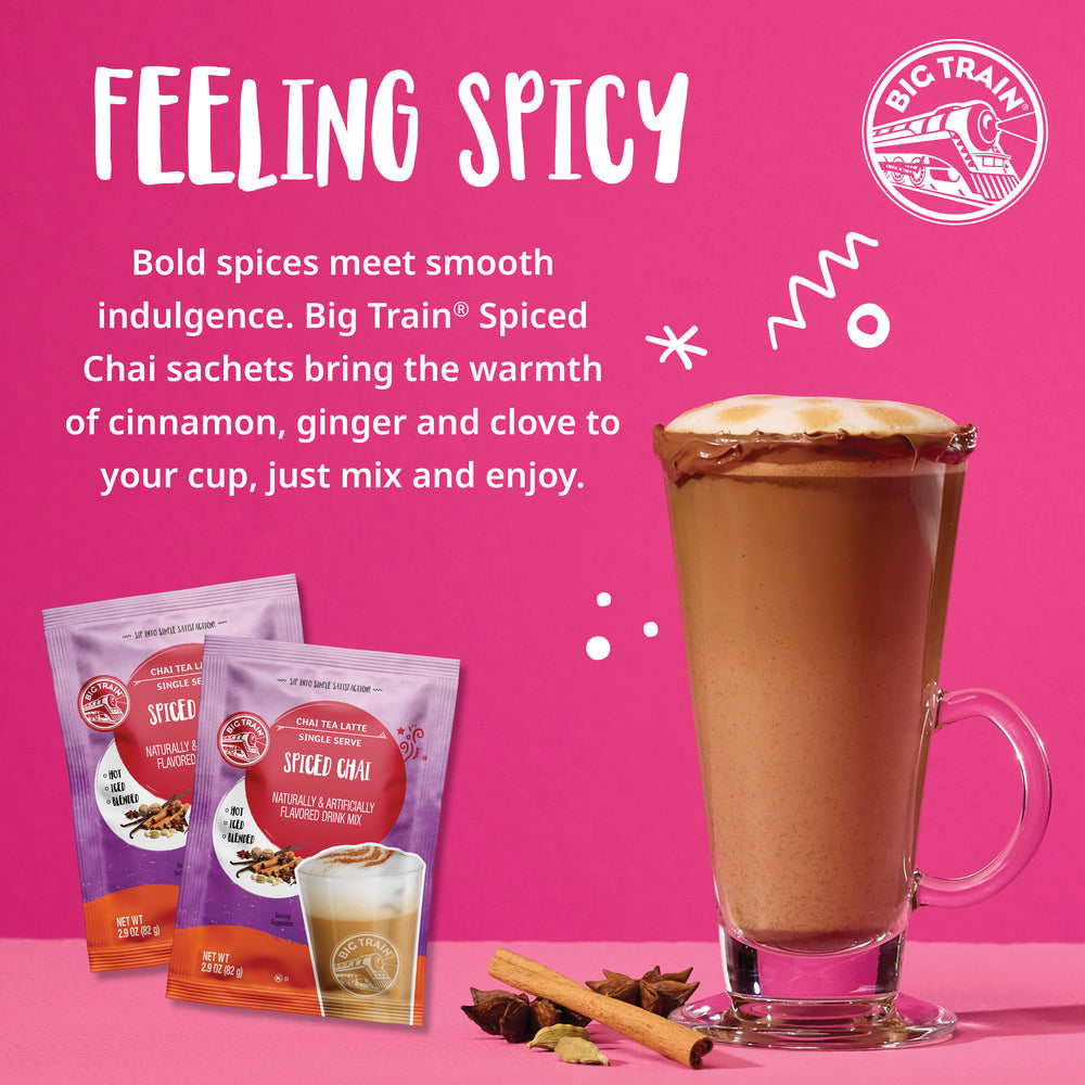 Big Train Spiced Chai Tea Latte Mix brings the café experience home. We start with invigorating Darjeeling black tea, then add our authentic masala spice blend of cinnamon, clove, cardamom, anise and ginger for the perfect spiced chai flavor. Sweetened with honey and real sugar, this creamy, low-fat chai mix delivers an exotic taste experience, finished with a hint of vanilla. Serve hot, iced or blended for a delicious treat any time. Each sachet is perfectly portioned for convenience and consistent flavor. Enjoy a classic chai latte journey in every cup.